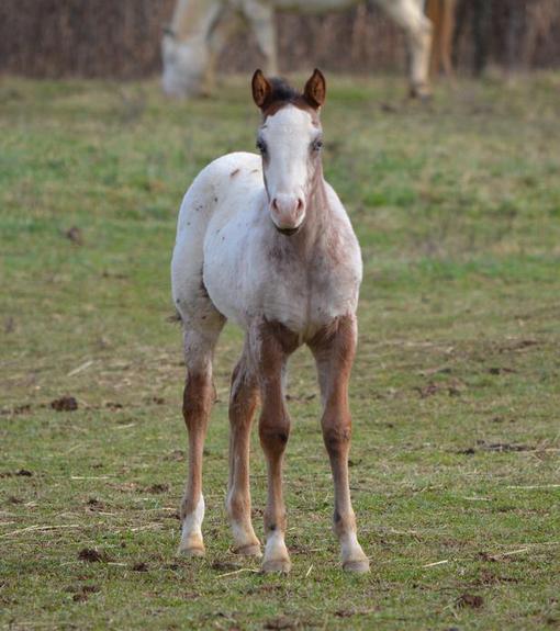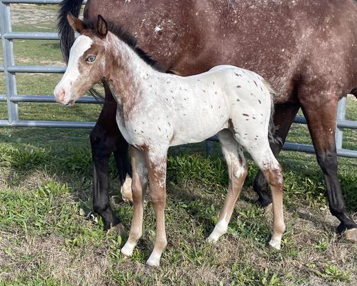Miss Wallaby Doc CC, also known as Rosie, joined us in February of 2021. I knew her dam, Teeka, as a three year old when I bred her to Dreamin Dun for a friend,and started her under saddle and I really loved her affectionate easy disposition. When her filly Rosie was offered to me, I quickly agreed remembering how nice her dam was. So here is Rosie, as a foal in Wyoming, and as a 5 year old here in my pasture looking wide as a house in foal to Samson for February 2023. Rosie's sire goes back to Hollywood Dun It, a national reining sire. Hollywood Dun It has broken every National Reining Horse Association siring record. Rosie's dam returns to many famous appaloosas, such as Wapiti, Navajo Britches and Joker B. Rosie awaits her 2026 foal in February .