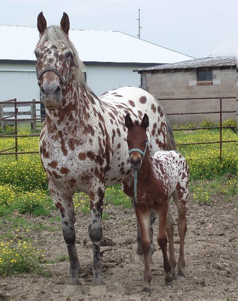 Harley first came to me as a weanling in trade for a mare in foal. My intention was to sell her, and after six months or so, I did to a nice woman from Ohio. Five years went by and Harley was grown and broke to ride. I had the opportunity to buy her back and was eager to do so. She is such a handsome young mare with very high percentage appaloosa bloodlines. That is how I came to have both baby pictures and current pictures of Harlequin Doubledott. Harley is bred to Nuggets Super Shado for a July, 2013 foal. Harley did pass on her loud foundation color with her first foal Cricket.